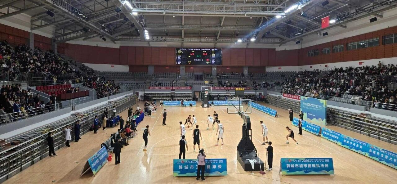 3月29日,我要上省运2026渭南市“千村百镇 美丽乡村”县域篮球联赛(韩城赛区)激战正酣,韩城代表队与澄城代表队在我市体育馆展开强强对话,为现场球迷奉献了一场精彩绝伦的篮球盛宴。市人大常委会副主任郭佩生、副市长马文娟、市政协副主席贾耀斌现场观看比赛,为双方队员加油助威。