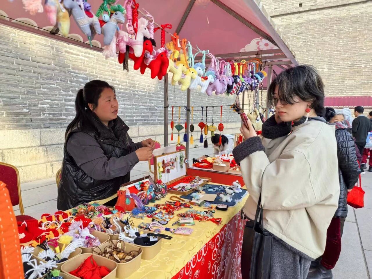 春节期间 ,古城景区人潮涌动。剪纸作品、印花袱子、手工挂面等非遗产品纷纷亮相市集。贾晓丽正在自家摊位前忙碌,她细心整理手工布艺玩偶,向游客讲解韩城八景纹样……引人入胜的讲解吸引众多市民和游客驻足选购。
