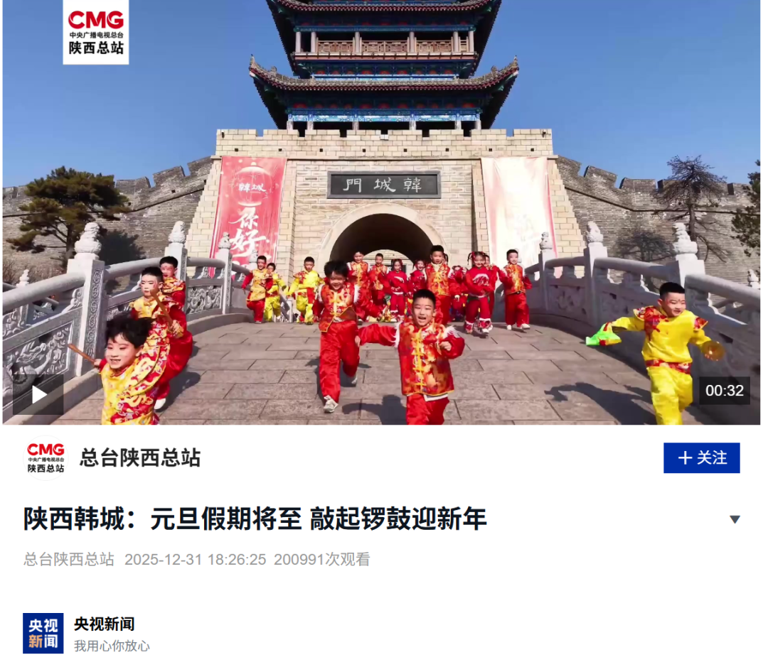 1月1日,市融媒体中心采编的《陕西韩城:敲起锣鼓迎新年》在央视4套《中国新闻》节目中播出。2025年12月30日,“鼓舞2026”迎新年群众文化活动在古城南门广场精彩开演,为广大市民游客送上一场充满本土特色和时代气息的文旅盛宴。