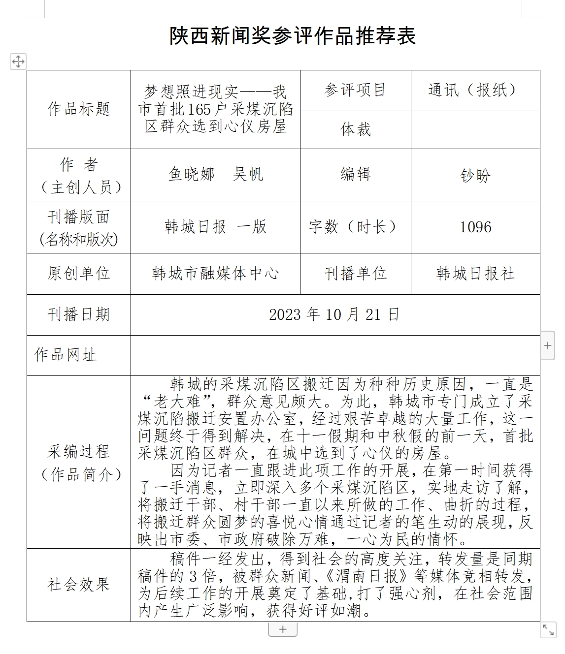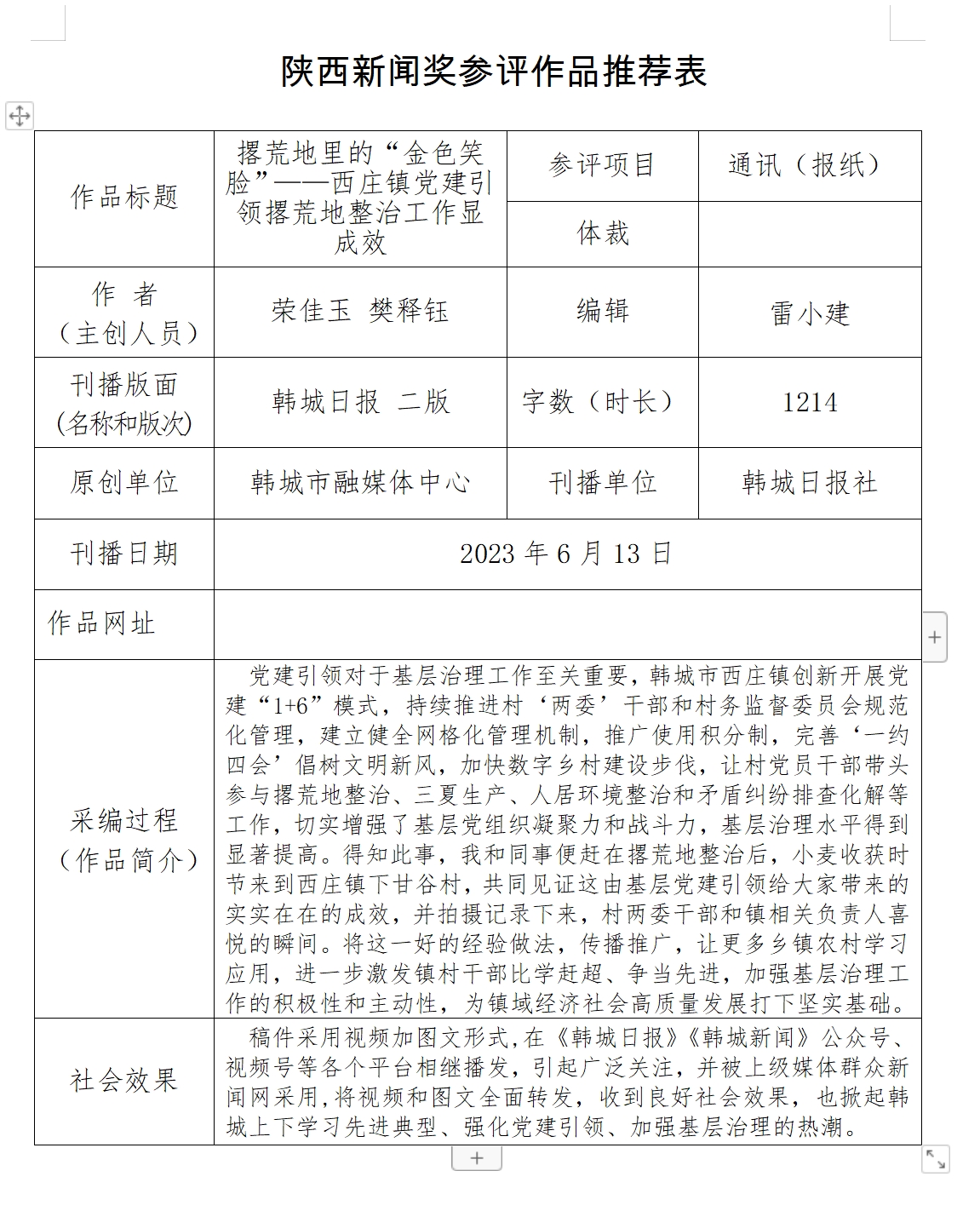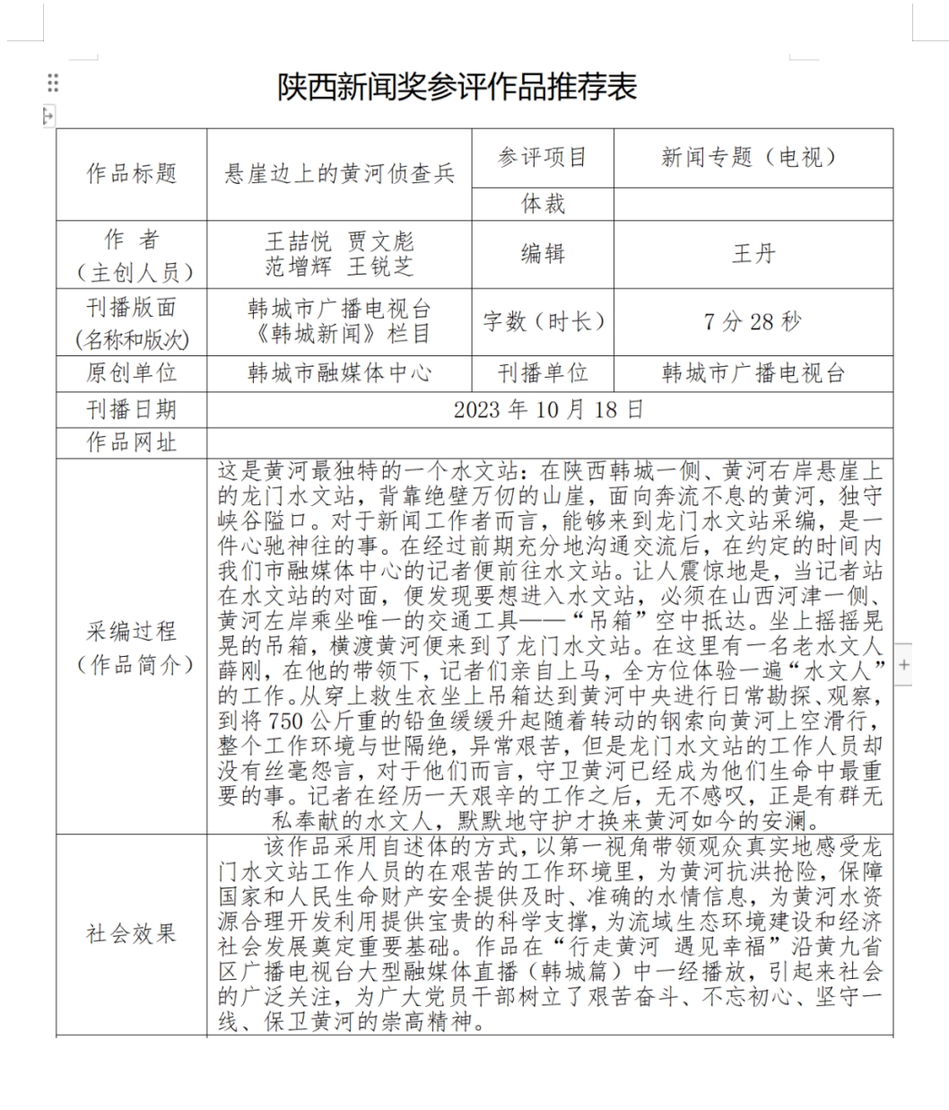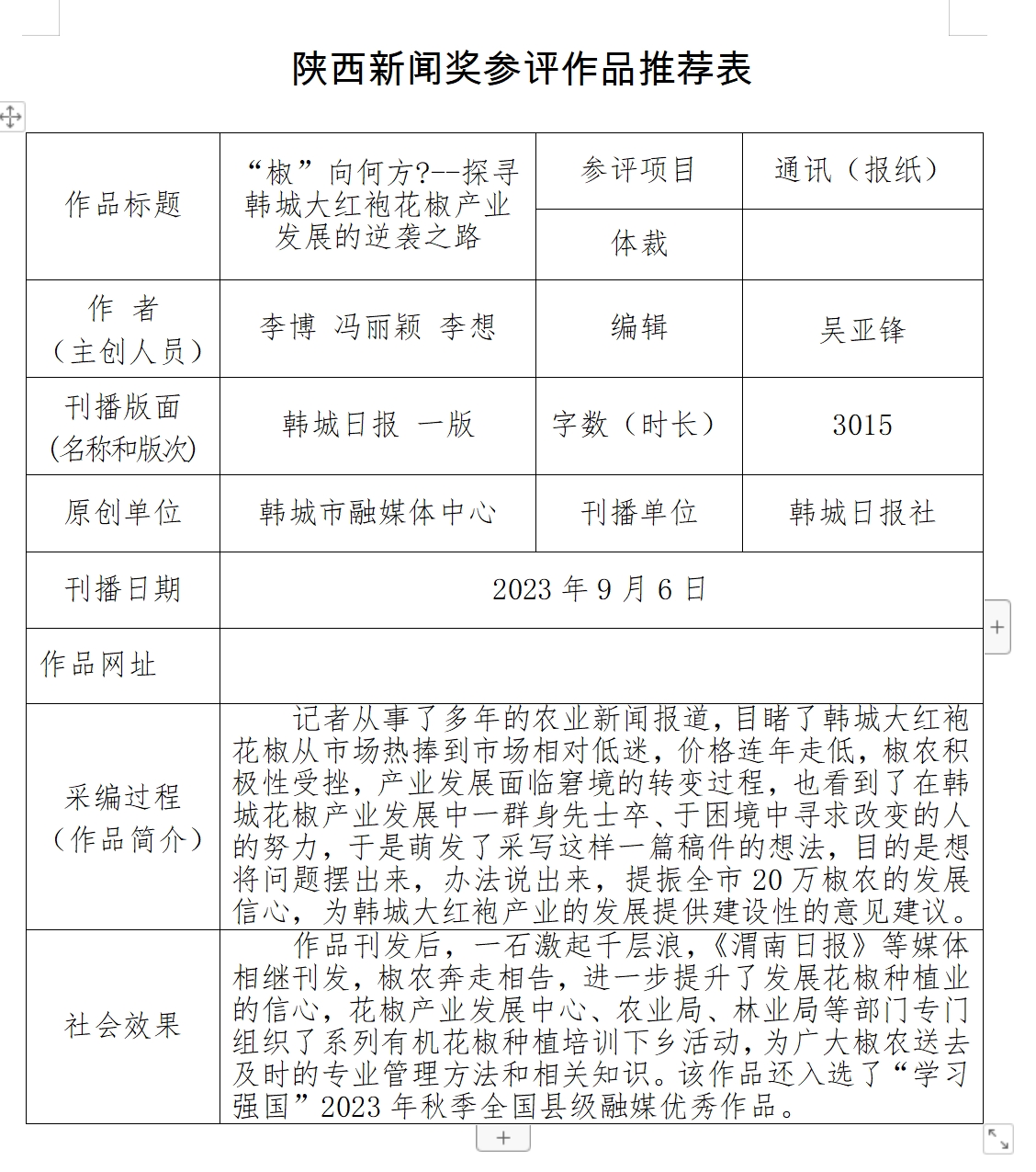 附件:参评2023年度陕西新闻奖作品推荐表16个