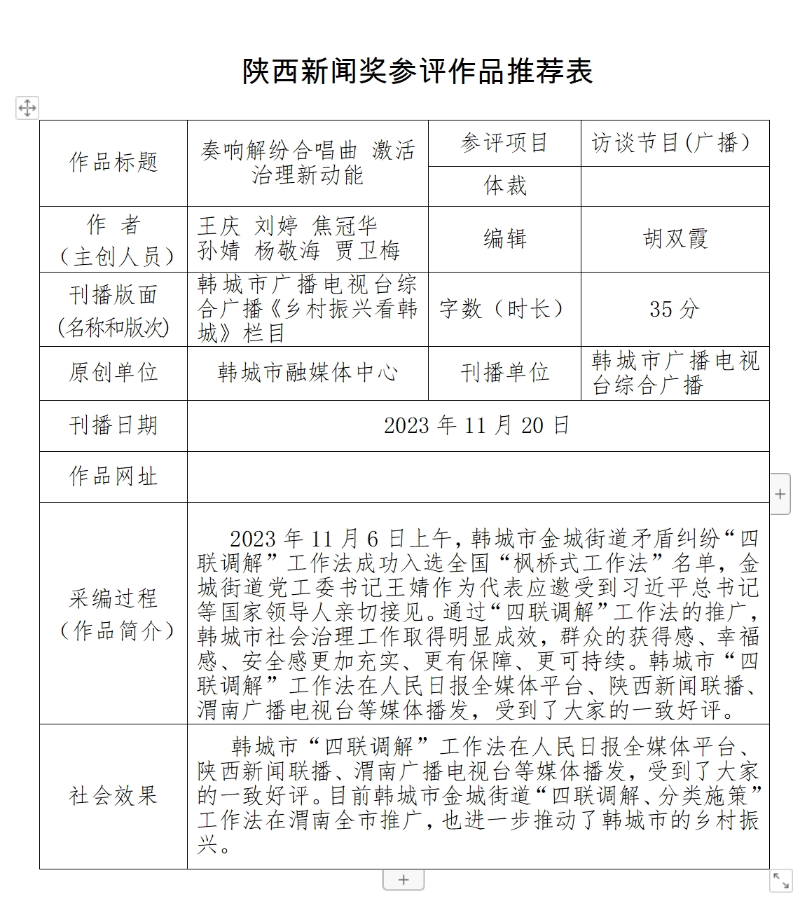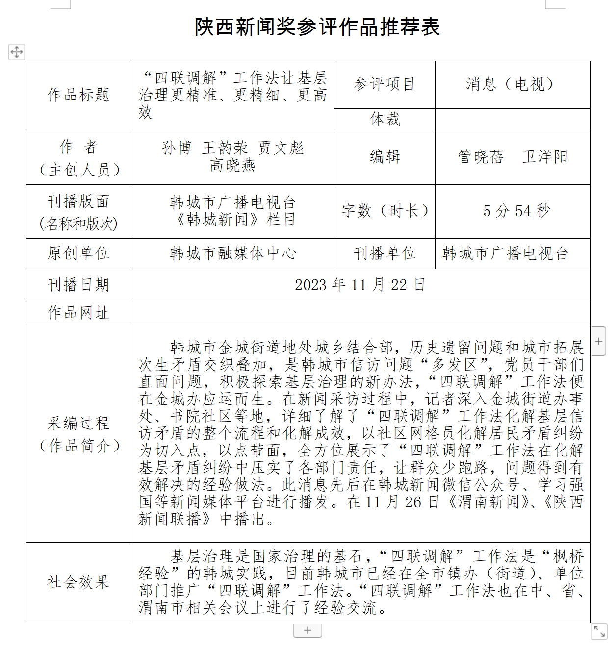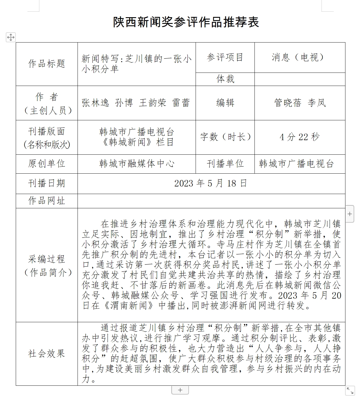 根据陕西省新闻工作者协会文件《关于2023年度陕西新闻奖、陕西省优秀新闻工作者报送工作的通知》要求,现对参加2023年度陕西新闻奖作品予以公示,公示时间:1月30日——2月4日。公示期间,若对公示内容有异议,请通过电话或书面形式向韩城市融媒体中心总编室反映。反映情况要实事求是,客观、公正、具体,并提供真实姓名和联系方式;匿名举报原则上不予受理。