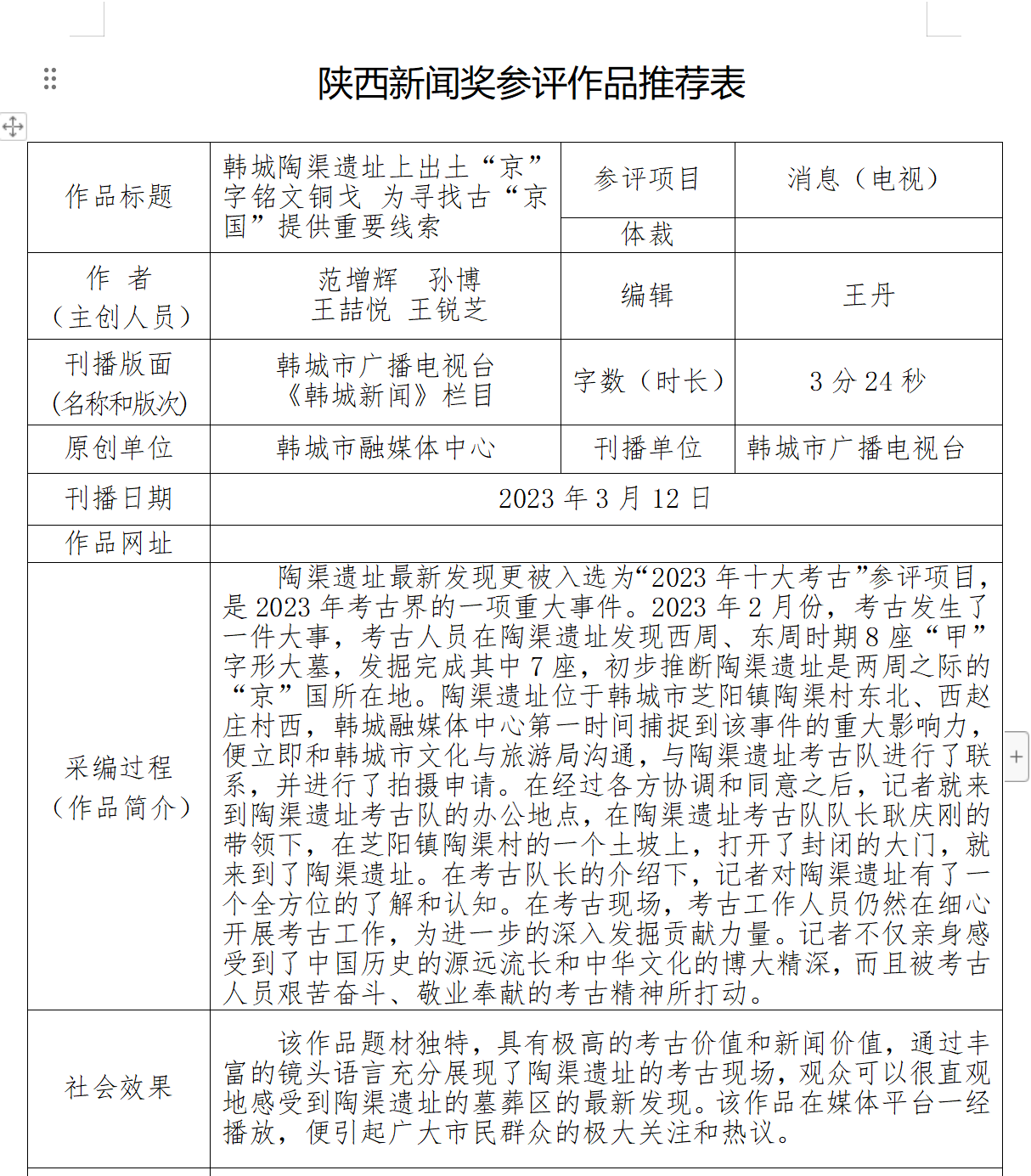 根据陕西省新闻工作者协会文件《关于2023年度陕西新闻奖、陕西省优秀新闻工作者报送工作的通知》要求,现对参加2023年度陕西新闻奖作品进行补充公示,公示时间:3月5日——3月11日。公示期间,若对公示内容有异议,请通过电话或书面形式向韩城市融媒体中心总编室反映。反映情况要实事求是,客观、公正、具体,并提供真实姓名和联系方式;匿名举报原则上不予受理。